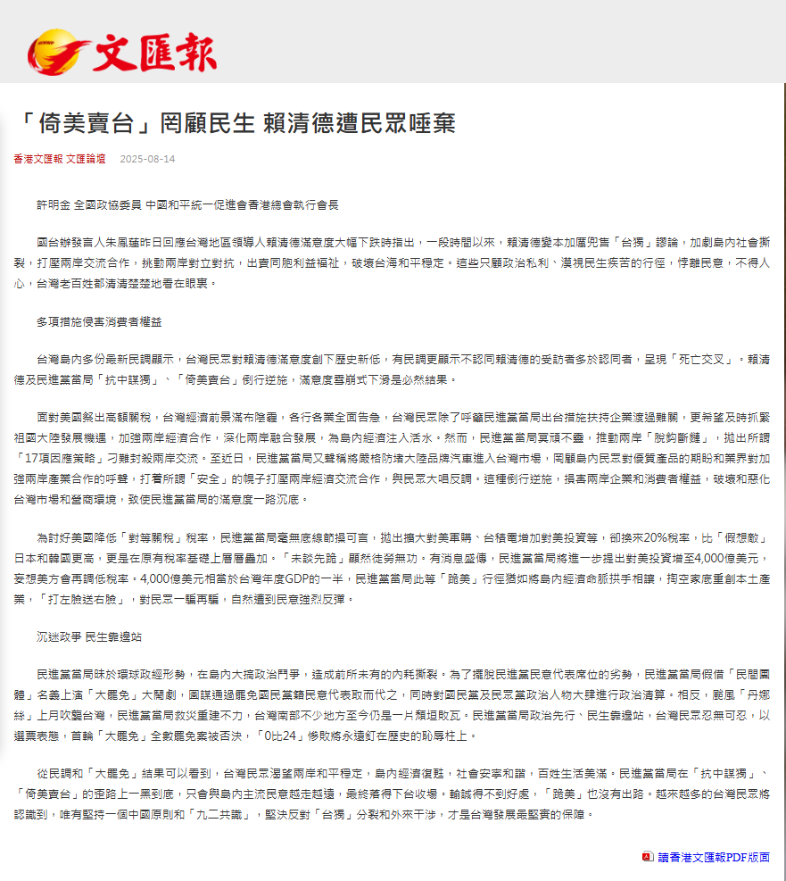 2025年8月14日,全國政協委員、廣東省福建商會會長、中國和平統一促進會香港總會執行會長、集團董事局主席許明金,在香港《文匯報》發表了“「倚美賣臺」罔顧民生 賴清德遭民眾唾棄”的文章。